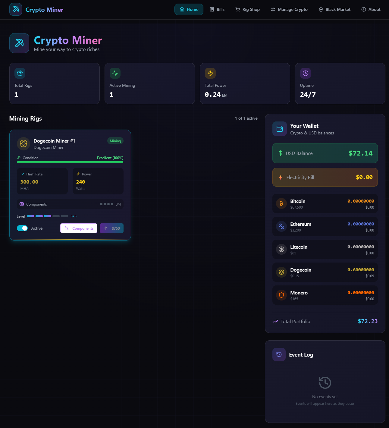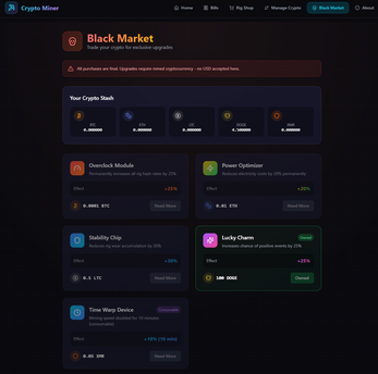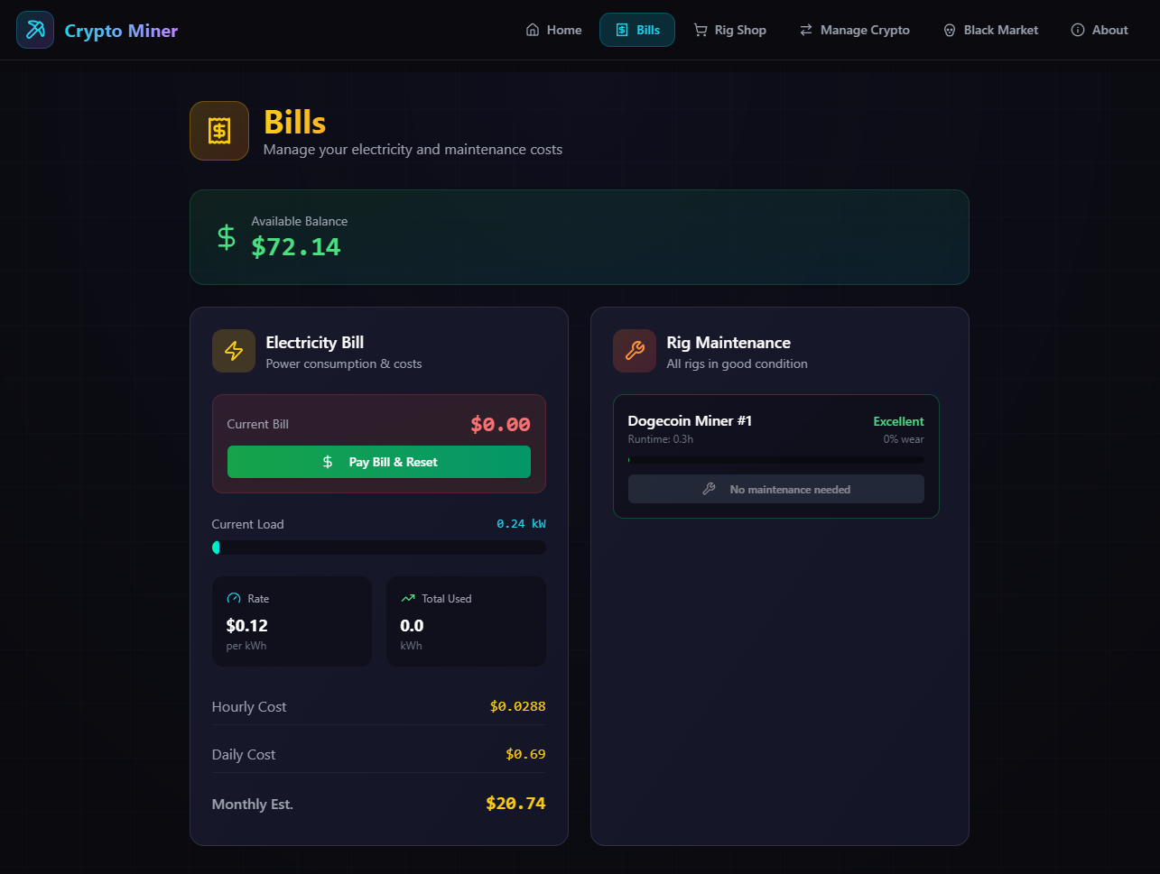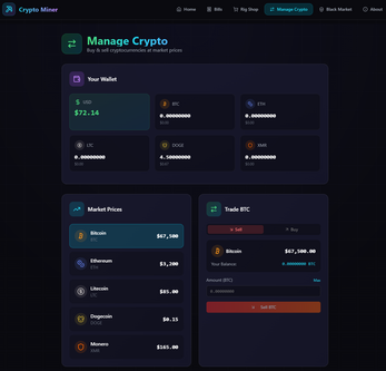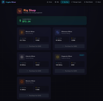 A fun and engaging game where you build your own crypto mining empire. Start with basic rigs, manage your electricity bills, and upgrade your equipment to become the ultimate Bitcoin and cryptocurrency tycoon! AND MUCH MORE!